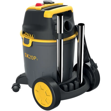 L’aspirateur SXVC20PTE aspire à la perfection poussières, liquides, saletés solides et grosses. Il est particulièrement indiqué pour les applications non seulement domestiques comme garages ou caves, mais aussi typiquement professionnelles comme chantiers de construction, ateliers industriels, ateliers de réparation automobile, lavages automobiles ou activités artisanales (par exemple, menuisiers, plombiers, préposés à la maintenance).La cuve à déchets de 20 litres est fabriquée en matière plastique solide et résistante. Dès que la cuve est pleine, le flotteur interne interrompt l’aspiration et signale le besoin de vidange. Le verrouillage/déverrouillage rapide du couvercle facilite le vidage de la cuve.L’aspirateur SXVC20PTE englobe aussi la fonction souffleur, très utile pour nettoyer les endroits difficilement accessibles ou impossibles à aspirer, par ex. les graviers.SXVC20PTE comporte un double système de filtration ultra efficace, composé d’un filtre cartouche haute efficacité lavable qui protège le moteur contre les poussières fines et les liquides, et d’un sac filtrant en papier dans lequel s’amasse la saleté solide pour en prévenir la dispersion dans la cuve.SXVC20PTE est un aspirateur à liquides léger, maniable, peu encombrant et, par conséquent, pratique à transporter, sur un fourgon par exemple. La poignée et les roues simplifient le déplacement. Les deux roues arrière de 18 cm de diamètre optimisent la stabilité, y compris sur sol irrégulier, comme celui des chantiers. Après l’emploi, tous les accessoires et le câble électrique se rangent dans les logements prévus à cet effet. PLUS•Bidon aspirateur multifonction pour solides et liquides avec fonction souffleur, cuve à déchets en matière plastique solide et résistante, indiqué pour les applications domestiques et professionnelles comme les chantiers de construction, les ateliers industriels, les ateliers de réparation automobile•Double système de filtration : filtre cartouche haute efficacité lavable + filtre en papier, qui apportent au moteur une protection totale contre les poussières fines et les liquides•Accessoires inclus : 1 flexible d’aspiration résistant à la torsion de 2 m ; 3 tubes d’aspiration en métal de 33 cm ; 1 suceur sol pour liquides ; 1 suceur sol pour solides ; 1 suceur tapis de sol et fauteuils ; 1 suceur fentes•Avec la prise intégrée pour outils électroportatifs incluant MARCHE/ARRÊT automatique, l’aspiration se met en marche dès que l’outil est utilisé pour aspirer immédiatement toute la poussière produite•Puissance absorbée (kW) 1,2 ; Dépression (mbar) 170 ; Débit d’air (l/s) 28 ; Capacité cuve (l) 20 ; Longueur du câble électrique (m) 5 ; Diamètre des tubes et flexibles d’aspiration (mm) 35 CONTENU DE LA BOÎTEAspirateur ; flexible d’aspiration (2 m) ; 3 tubes d’aspiration en métal (3×33 cm) ; filtre cartouche haute efficacité ; sac filtrant en papier (20 l) ; suceur sol pour liquides ; suceur sol pour solides ; suceur tapis de sol et fauteuils ; suceur fentes ; adaptateur outils électroportatifs