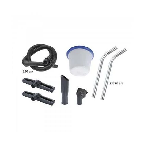 Livré avec: 1 flexible d’aspiration, 2 tubes d’aspiration chromés, 1 brosse eau, 1 brosse poussières, 1 lance plate, 1 brosse à meubles, 1 filtre de protection moteur.
