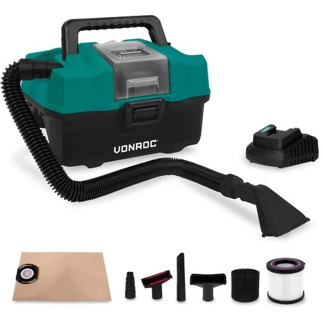 Ce set complet est livré avec une batterie VPower 2.0Ah et un chargeur de batterie. Il est possible de commander, en option, les batteries interchangeables 2.0Ah ou 4.0Ah ainsi que le chargeur rapide. Si vous souhaitez combiner votre aspirateur avec une autre machine VONROC VPower, vous n’avez besoin que d’une seule batterie et d’un seule chargeur de batterie ! Commandez l’aspirateur VC508DC seul, qui est livrée sans batterie, ni chargeur. Achetez seulement ce dont vous avez besoin.