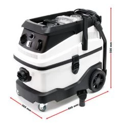L’aspirateur est équipé d’un tuyau de 2,30 m de longueur qui se caractérise par une grande flexibilité et une capacité d’extraction de 1150 m³/h. Par ailleurs, le châssis souple et la poignée robuste confèrent à l’outil une mobilité telle, que vous pouvez le transporter sans problèmes.